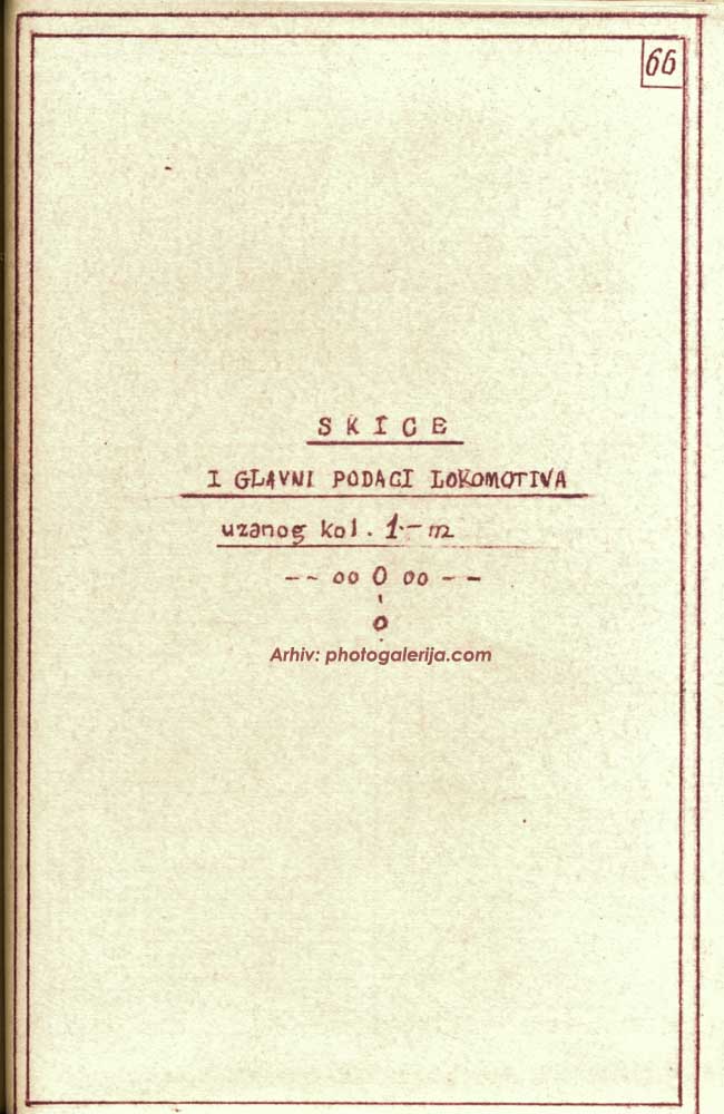 - Skice lokomotiva – znak sopstvenosti JŽ serije: 01 (ex. 1000 SDŽ); 05 (ex. 389 JDŽ); 06 (ex. 486 JDŽ); 07 (ex. 380 k.k.StB); 09 (ex. 28 DRG); 11 – dva tipa (ex. 424 MAVAG); 16 (ex. 414 JDŽ); 16V. Brod n/S; 17 – dva tipa i podaci o kotlovima (ex. 342 MAV); 20 (ex. 6000 SDŽ); 22 – dva tipa i svi tehnički podaci razlika ove serije pojedinačno (ex. 324 MAV); 23 – dva tipa (G7 KPEV); 26 (ex. 7000 SDŽ); 27 (ex. 401 MAV); 29 (ex. 81 k.k.StB); 30 (ex. 583 JDŽ); 31 (ex. 651 MAV); 32 (ex. 601 MAV); 33 (ex. 30 HDŽ-52 DRB); 35 (bivša 57); 37 (UNRRA pružne); 38 (ex. 1-D-D „Liberation“); 50 – dva tipa (ex. 376 MAV); 51 – tri tipa sa svim podacima u razlikama ove serije (ex 375 MAV-10 BHMB); 61 (ex. 2000 SDŽ); 62 (UNRRA manevre); 62 (Đuro Đaković); 102 (ex. 220 MAV); 105 (ex. 222 MAV); 108 (ex. 429/35/688); 108 (ex. 60 BHMB); 120 (ex. 370 MAV); 121 (ex 37 St.B); 122 (ex. 69-78 SDŽ); 124 (29 JŽ); 125 (ex. 320 MAV); 126 (ex. 325 MAV); 127 (ex. 48 k.k.StB); 129 (ex. 70 BHMB); 134 (ex. 21-24 SDŽ); 151 (32 d JŽ); 152 (ex. 377 MAV); 154 (ex. T9 KPEV); 156 (ex. 475 MAV); 160 (ex. 11 MAV); 163 (ex. 1-?);