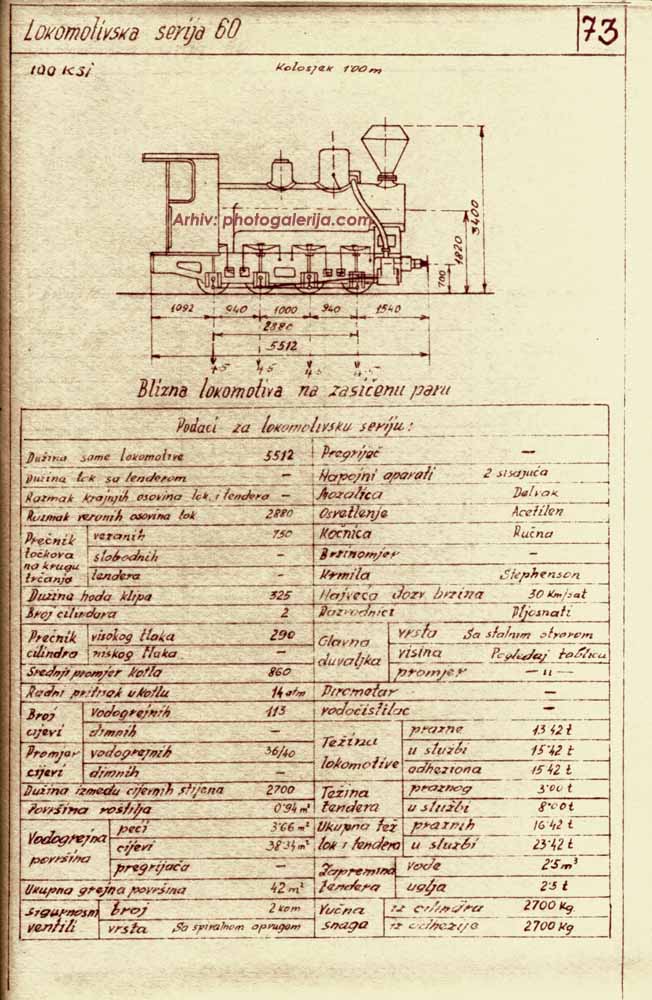- Skice lokomotiva uzanog kolosijeka 1000 mm – znak sopstvenosti JŽ serije: 21 KSI 165 – cviling na zasićenu paru; 30 KSI 65 – cviling na zasićenu paru; 40 KSI 60 – blizna; 50 KSI 80 – blizna; 60 KSI 100 – blizna; 70 KSI 100 – compaund;