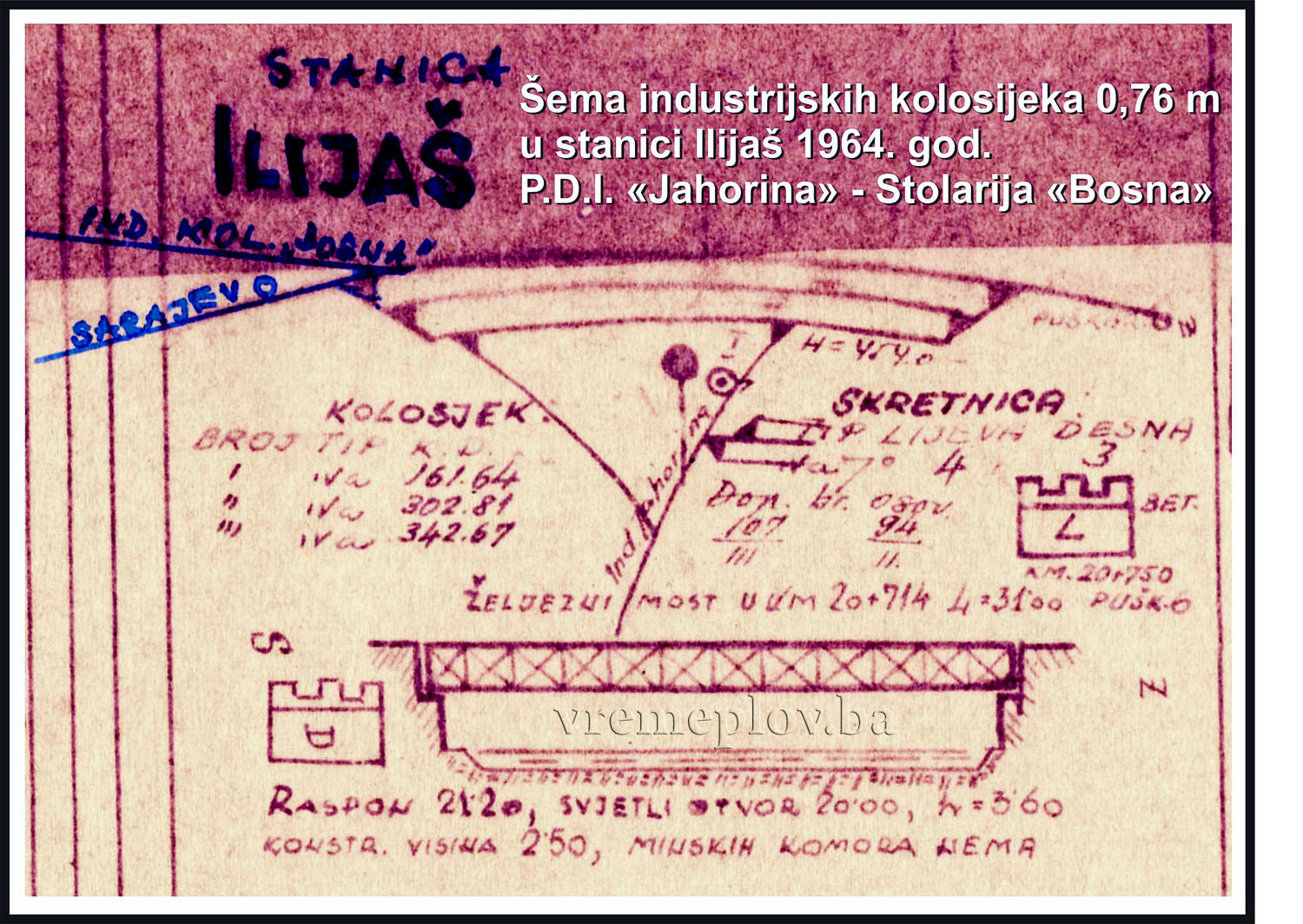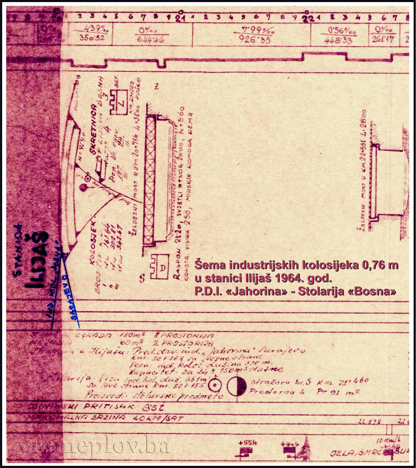 Insight into the archival documentation (Report on Forest-Industrial Railways within the Territory of the State Railways Sarajevo, June 1926), the company “Buttazzoni i Venturini” – Forest Industry Ltd., based on recorded data, states regarding the forest railway “Ilijaš – Misoča”: Extension of the line towards the forested area Blaže (Zvijezda Mountain) 5.850 km., the branch line from profile at km 32+340 Kaljavi Stream with a length of 3.400 km., and extension with a geared railway to the Ravnje site with a length of 2.100 km., the branch line from profile at km 34+120 Rakov Stream with a length of 1.100 km., the railway network within the territory of Strugare 0.650 km., and the connecting track between the Ilijaš station and the main (Bosanski Brod – Sarajevo) railway in a length of 0.200 km, totaling approximately 45.300 km. (Source: Archives of BH – D.Ž.S. 1926. No. 16027/I – 1926).
