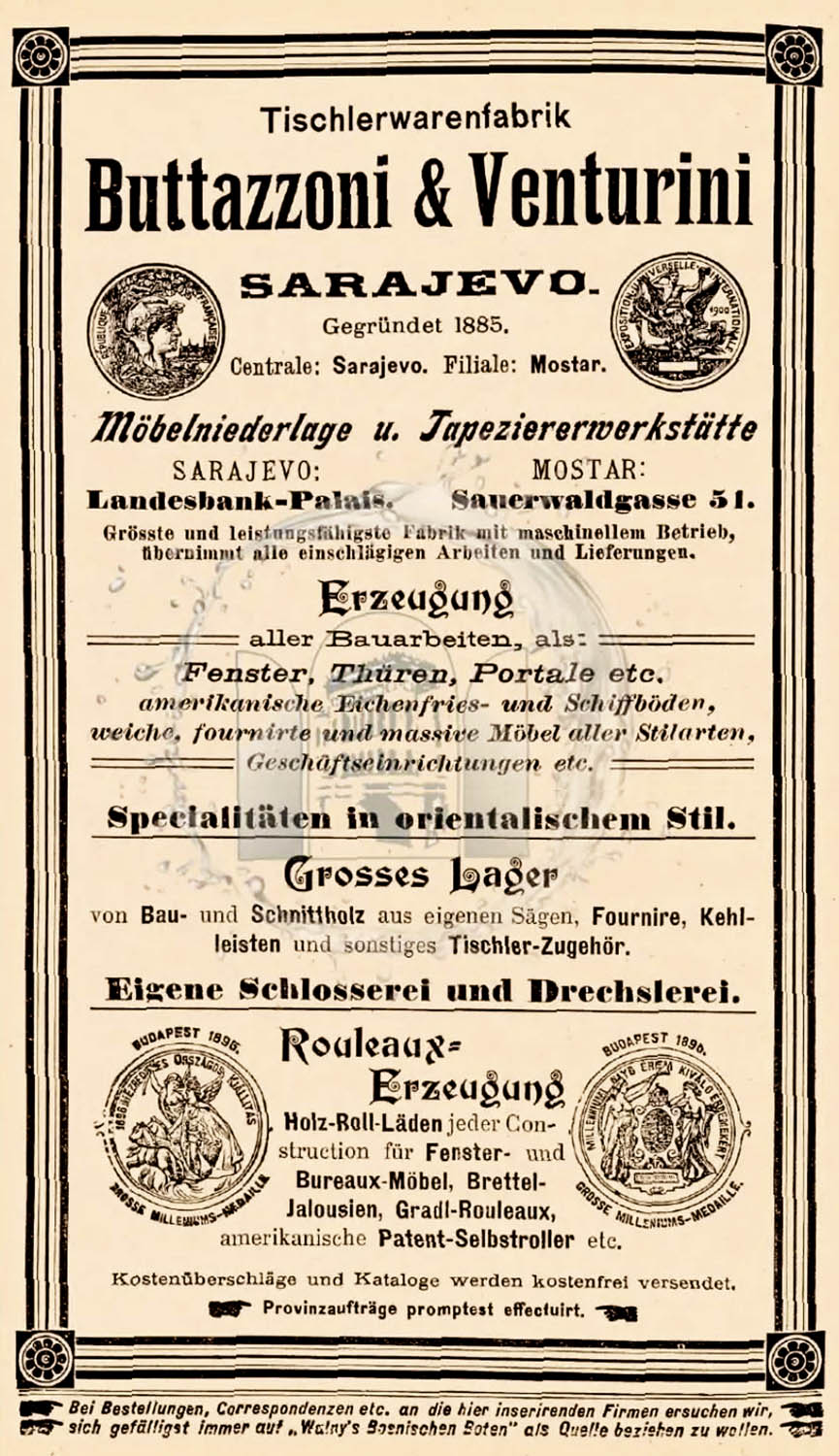 In 1885, Peter Buttazzoni, a carpenter by profession, and Ivan Venturini, a carpenter and machinist from Italy, migrated to Sarajevo and registered the company “Buttazzoni and Venturini,” with an initial capital of two million crowns, with a clause that each shareholder signs for themselves. The primary activity was the production of building carpentry and furniture, as well as exporting goods abroad. With this starting capital, they built a steam sawmill in Sarajevo (near Koševski Stream) and a carpentry factory (“Tischler Warenfabrik”) with a warehouse for sawed timber (“Holzplatz”) and firewood. The address registered for residence, along with the factory, is in Kolodvorska Street (“Bahnhofstraße”) in the municipal area of Ferhadija. (Source: Bosanski Glasnik, 1902).