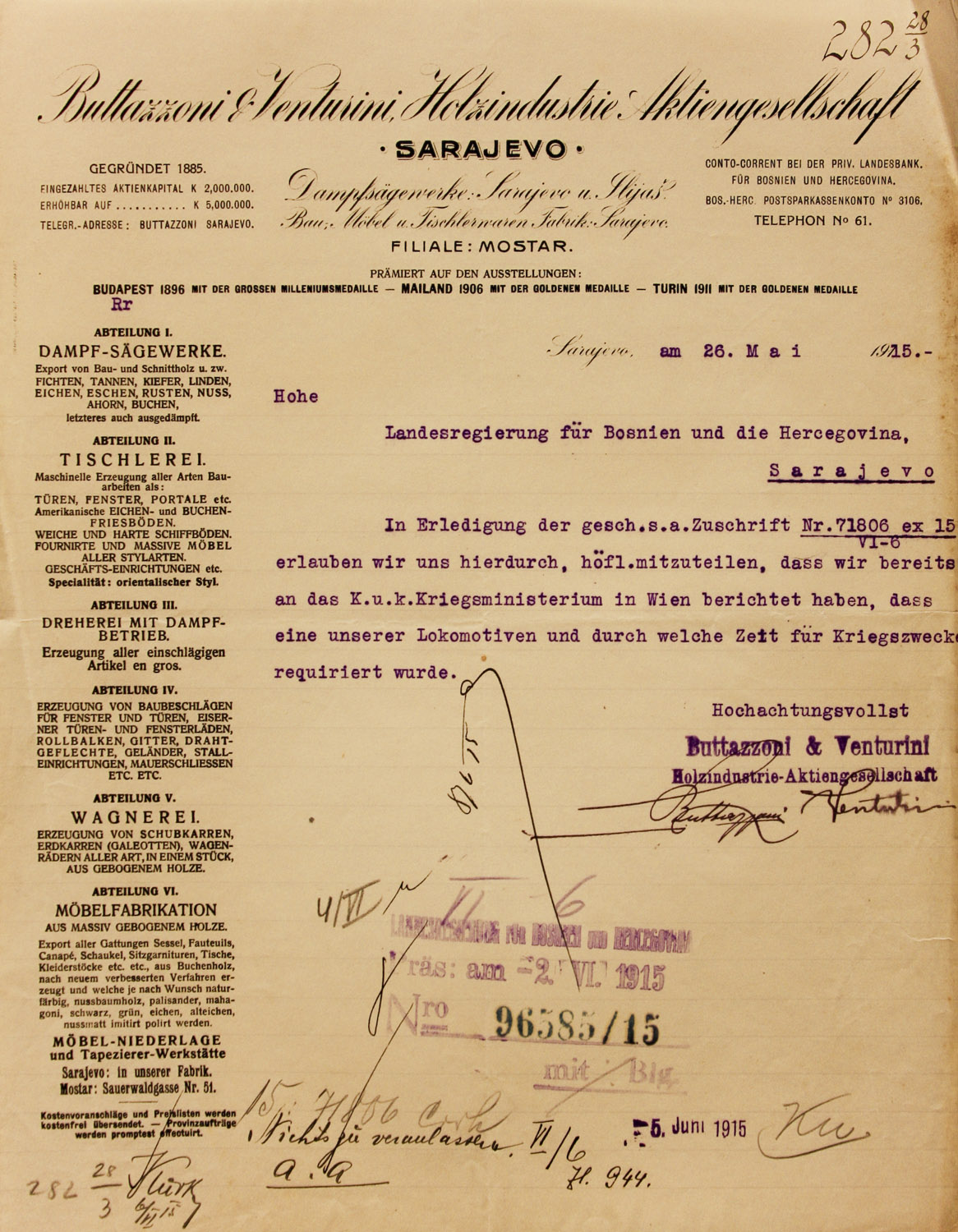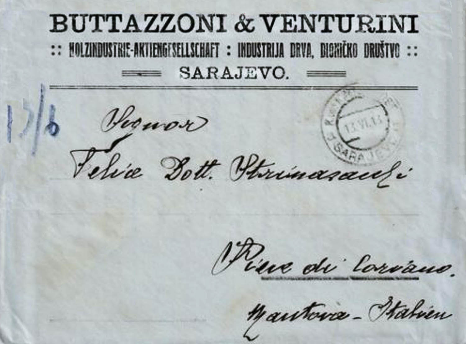 In 1912, a joint-stock company was established under the name “Buttazzoni and Venturini” – Wood Industry Ltd. (Buttazoni und Venturini Holzindustrie A.G.) in Sarajevo, created through the integration of the companies “Buttazzoni and Venturini” and the Inocuous enterprise “F. Steinmetz.”