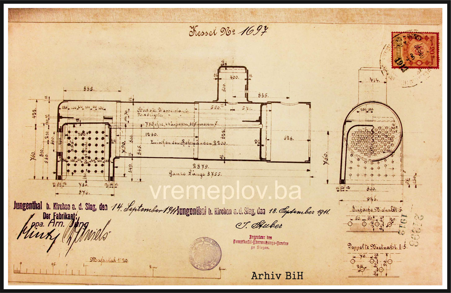 Locomotive of series (boiler number) 1697, manufactured in 1911 at the factory Arn. Jung – Jungenthal b. Kirchen. This locomotive, 0-4-0 with four coupled axles, was the first locomotive acquired for the Ilijaš – Misoča forest railway. Namely, according to the protocol dated June 14, 1912, a test drive was performed over a distance of 12 km and all technical parameters were satisfied. (BiH Archive, File 2498/1912, code 182-23). In 1915, the War Ministry (K.u.K. Kriegeministerium in Wien) mobilized the locomotive ‘for military purposes’ and sent it to Bosanski Brod for the construction of the narrow-gauge railway line Bosanski Brod – Slavonski Brod – Sibinje. According to data from the 1932 census, it was sold in 1936 to the firm Böhmische Gesellschaft für Feldbahnbedarf GmbH, Prague, with headquarters in Vinkovci. We have no further information about the fate of this locomotive.