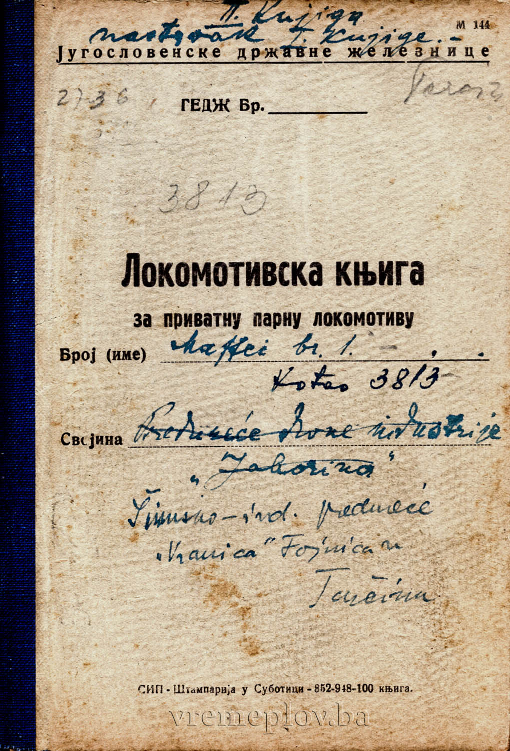 Locomotive of series (boiler number) 3813, manufactured in 1912 at the Maffei factory – Munich. Work name “Maffei No. 1.” This locomotive, 0-4-0 with four coupled axles, was the second in the fleet of the mentioned company’s rolling stock. It worked almost its entire career for the sawmill in Ilijaš until 1961, when it was assigned to the company “Jela,” Tarčin, and later to Š.I.P. “Vranica” Fojnica, until the end of 1965 when it was decommissioned.