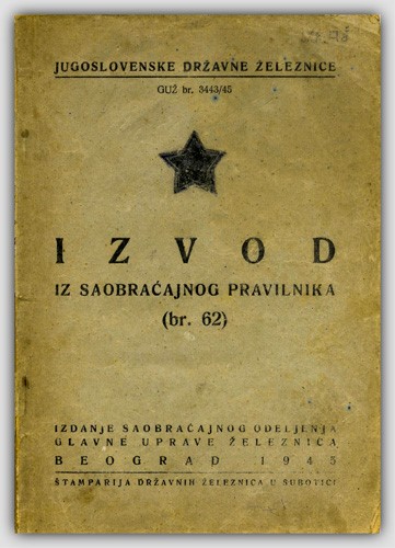 Објављујемо Извод из саобраћајног правилника (бр. 62) Југословенских државних жељезница, ГУЖ бр. 3443/45 у издању саобраћајног одељења Улоге Железница Београд 1945. године, штампан у штампарији Државних жељезница у Суботици.