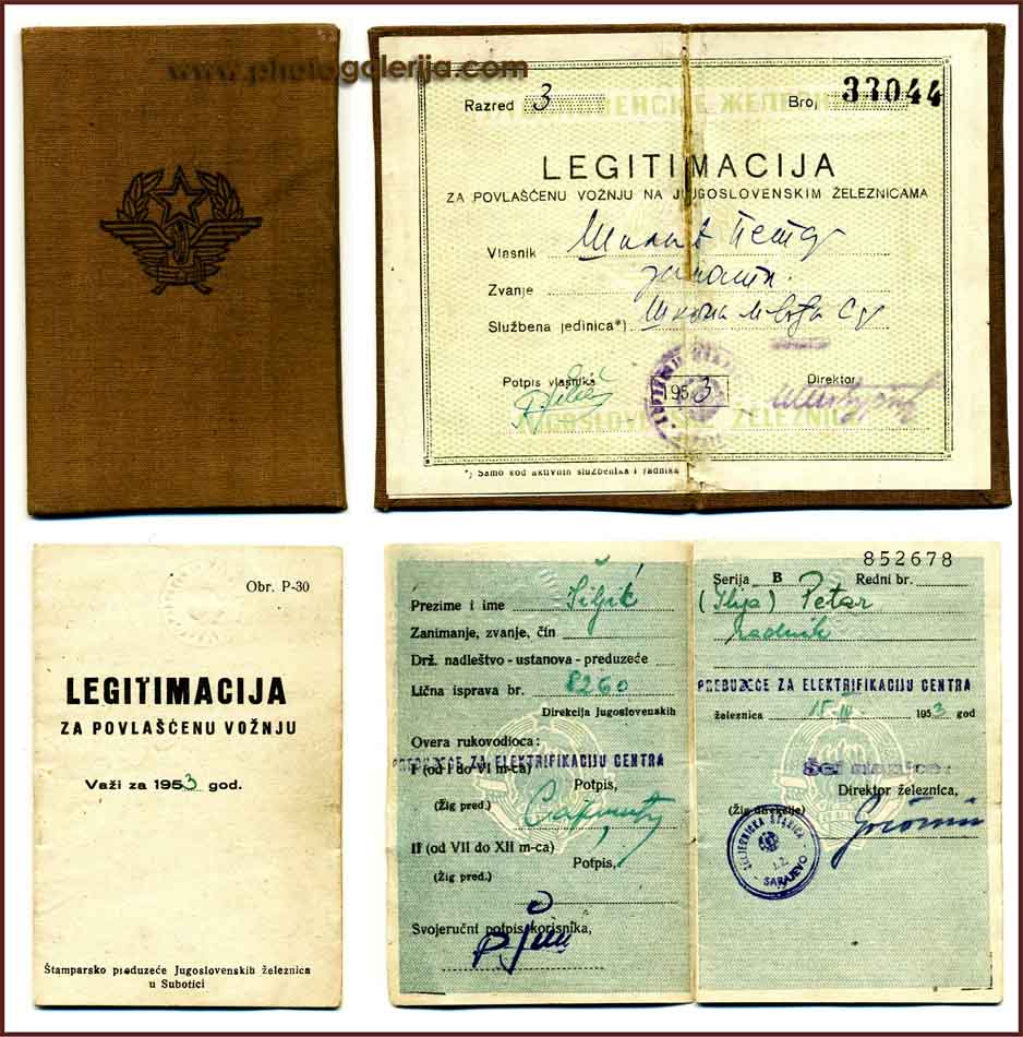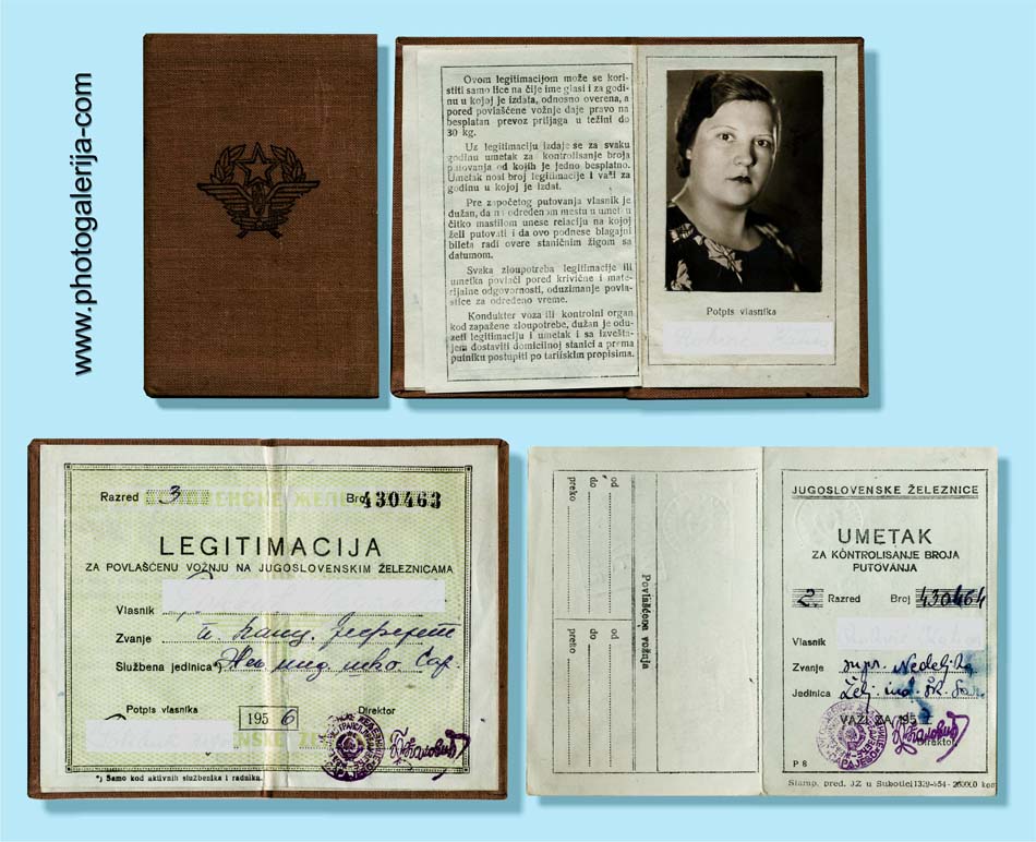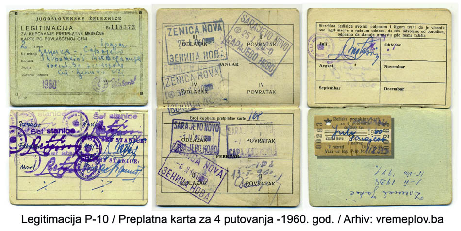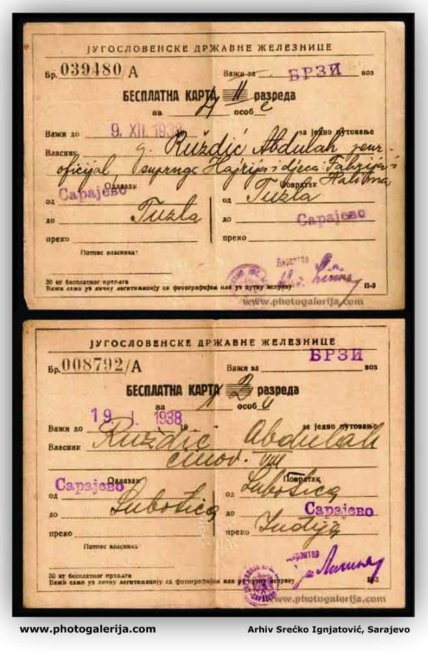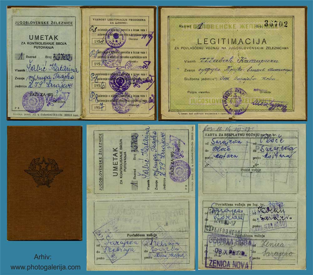 Na ovoj stranici objavljujem vozna dokumenta za prevoz putnika i robe. Dokumenta potiču iz perioda od 1920. do 1961. godine na železnicama: Jugoslovenske državne železnice (JDŽ – Kraljevina Srba, Hrvata i Slovenaca), Hrvatske državne železnice (HDŽ – NDH 1941–1945) i Jugoslovenske železnice (JŽ – FNRJ/SFRJ). U galeriji možete videti vozne karte za unutrašnji saobraćaj uzanih pruga u BiH (povlašćene i besplatne karte), međunarodne vozne karte, mesečne (pretplatne) karte, legitimacije (sa popustom i za kupovinu mesečnih karata), potvrde o ličnoj identifikaciji, sprovodne listove (ekspresne pošiljke), knjižice i dr.