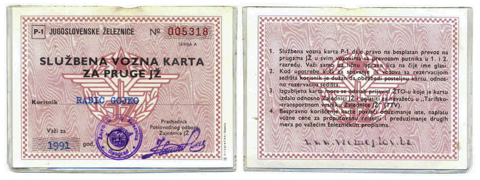 Jugoslovenske Železnice-Legitimacija za povlaštenu vožnju 1983.godine